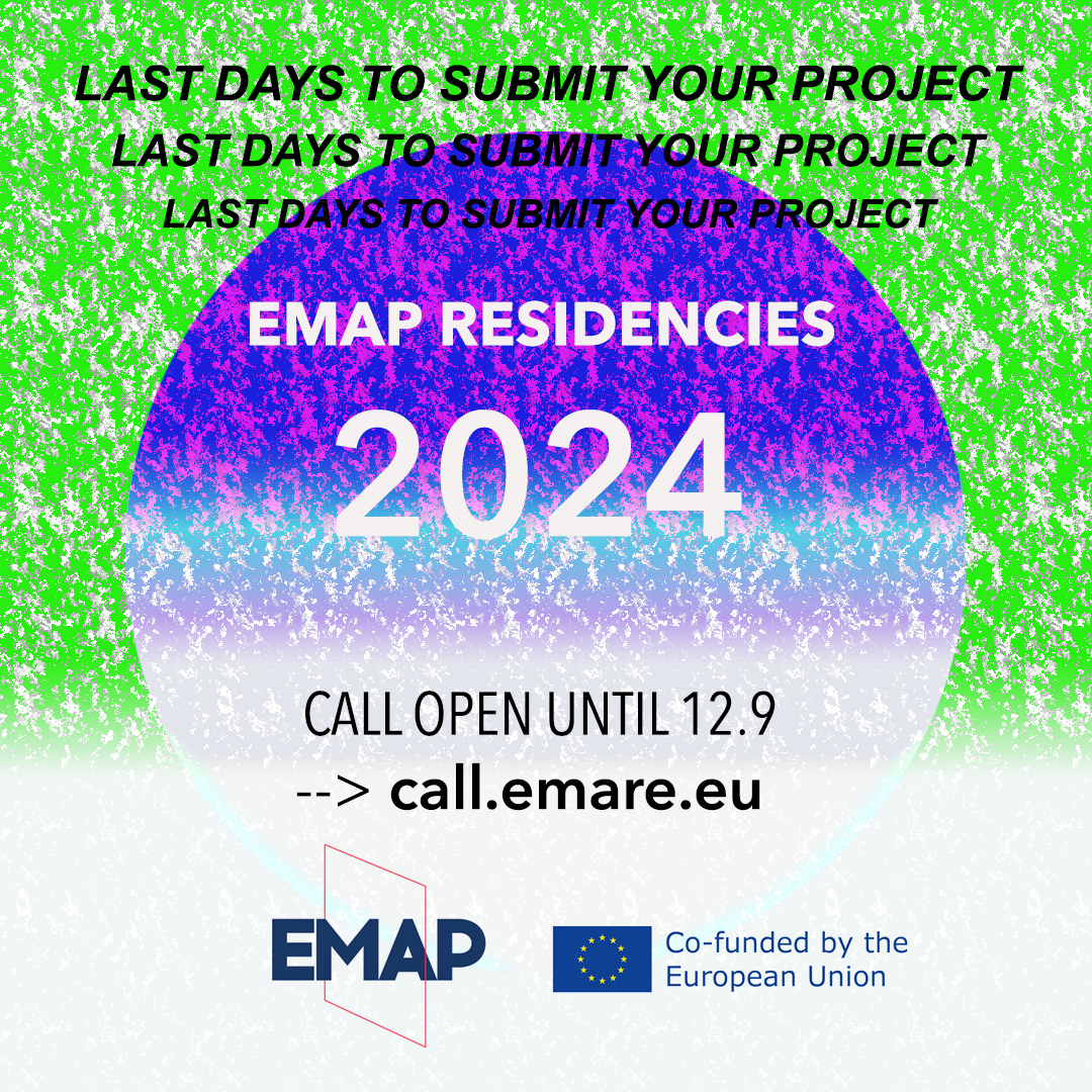 Applications should be submitted online at call.emare.eu and must include a CV, (audio)-visual documentation of previous work, and a preliminary plan and presentation of the proposed project to be developed within the EMAP residencies programme. Collaborating artists do not have to be decided at the time of submission.